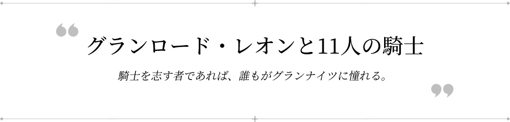 ラグナデア王国では、騎士のうち最も優れた者たちをグランナイツと呼ぶ。中でも黒き龍を倒したグランロード・レオンと11人の騎士は、グランナイツの中でも伝説的な存在となった。崇高な意志と、優れた能力を持つグランナイツ。今でも騎士たちは、グランナイツとなる事を夢見ている。