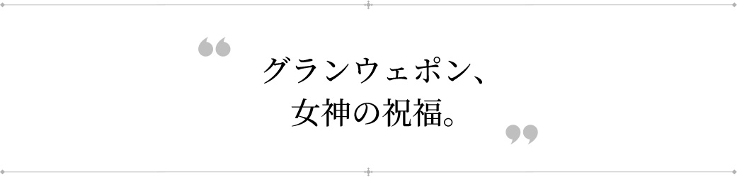 女神の祝福は、強く美しく生きる者に授けられる。グランウェポンとその召喚者の意志は、女神に認められた者にのみ、新たな能力として現れる。それは、過去の栄光を描いた儚き軌跡であり、現在を生きる人々の意志が描く確かな奇跡である。不滅を持つ者は、死をも恐れない。顕現した魂に、魂と共に歩むべき道を往くあなたに、女神が微笑みかけ、永遠の祝福を授けるだろう。